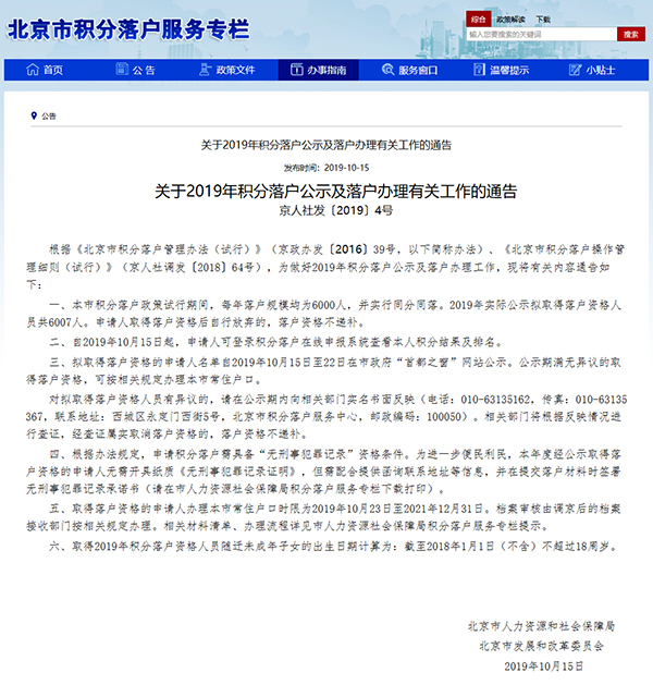 10月15日,市人力资源社会保障局发布消息,本市2019年积分落户申报审核工作已全部结束,自10月15日起进入公示及落户办理阶段。届时,今年申报积分落户的106403名申请人可登录积分落户在线申报系统查看本人年度积分和排名,拟取得落户资格人员名单将在市政府“首都之窗”网站公示,公示期截止到2019年10月22日。