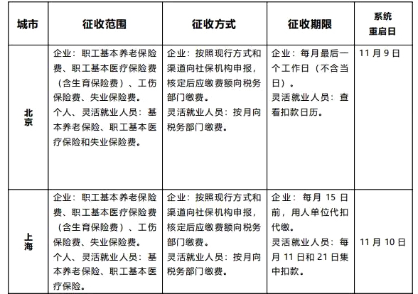 根据国务院关于社会保险费征收体制改革部署,包括上海,北京、天津、新疆、西藏、吉林、山东、山西、四川、江西在内的全国近14个省市,各地各自都发布了企业社会保险费交由税务部门征收的通知,自2020年11月1日起,全省范围内企业职工各项社会保险费及机关事业单位职业年金交由税务部门统一征收。简单的说,社会保险征缴和个人所得税征缴由之前社保和税务两个体系合二为一,统一到税务部门征收,但社保依旧是社保,依然保留社保核定的重任,所以社保税征,绝对不是社保入税。