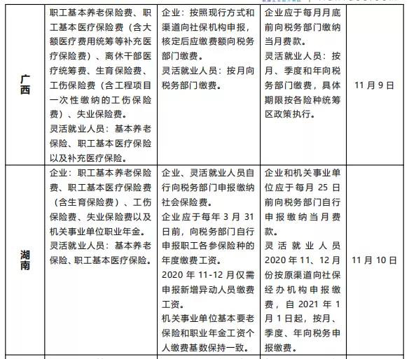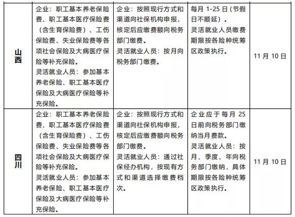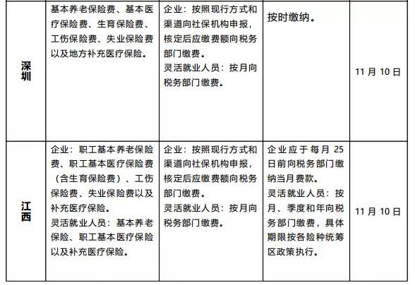 3、缴费主体及方式不变:企业按照现行方式和渠道,在规定时间承担代扣、申报、核定并缴纳当月社会保险费;灵活就业人员自行向税务部门缴费,申报时间根据当地规定日期上报。