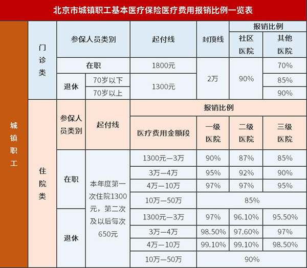目前,北京市在职职工医院门诊报销比例达到70%以上,退休人员达到85%以上,社区卫生机构报销比例均为90%,门诊封顶线为2万元。