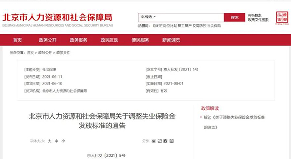 北京市人力资源和社会保障局 关于调整失业保险金发放标准的通告