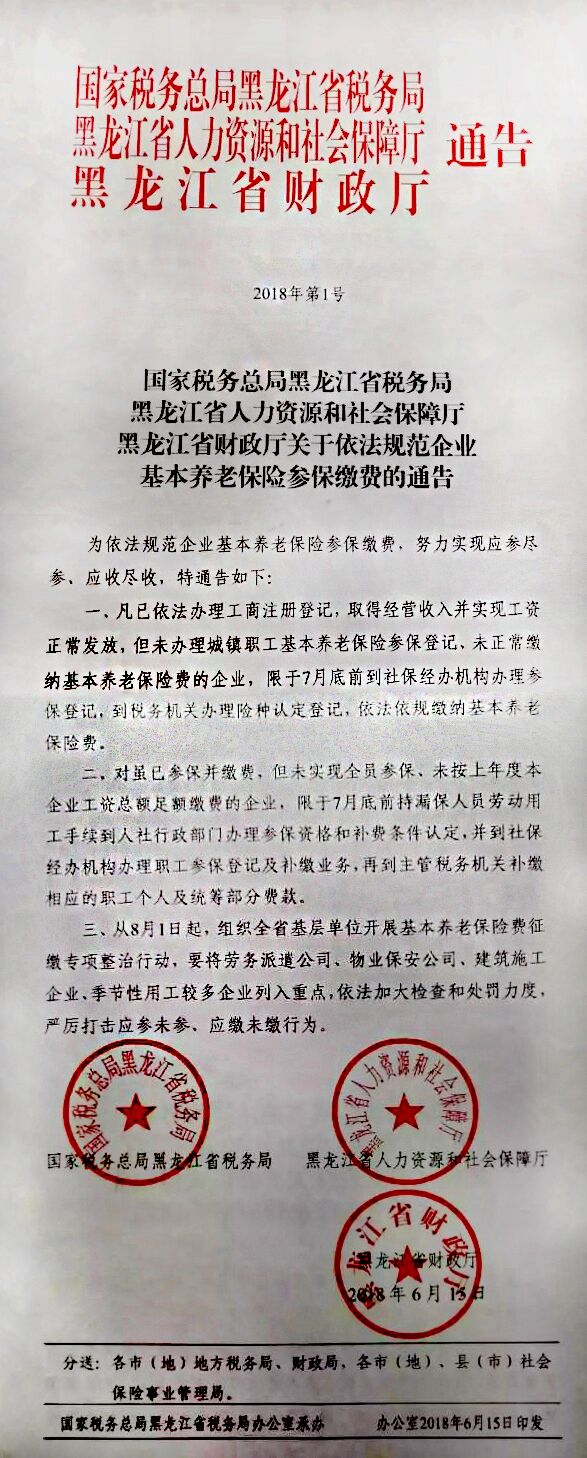 社保基金当期收不抵支的黑龙江省,在国家税务总局黑龙江税务局挂牌第一天,就联合省人力社保厅、财政厅下发了2018年一号文件,具体内容如下: