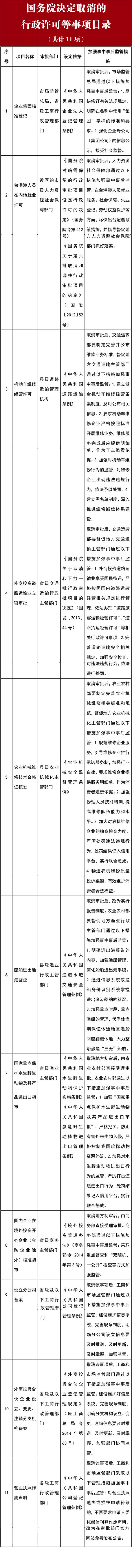 近日,国务院印发《关于取消一批行政许可等事项的决定》,决定取消11项行政许可,包括企业集团核准登记、台港澳人员在内地就业许可、营业执照作废声明等。